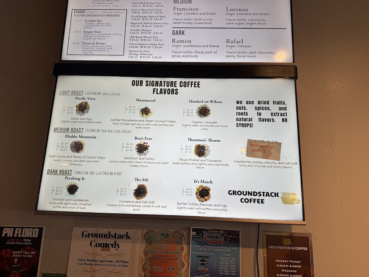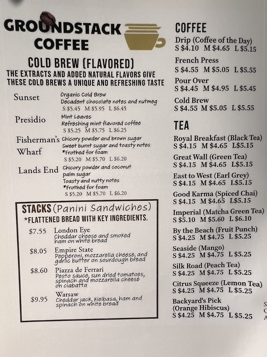 Introducing the menu at Groundstack Coffee offers a refined coffee experience rooted in natural flavors and expert craftsmanship. Located on Pacific Ave in Stockton, Groundstack invites you to savor rich blends like their French Press and Aeropress coffees, each priced thoughtfully at $8.05. For a refreshing twist, their Peach Mango, Watermelon Cucumber Mint, and Strawberry Açaí drinks are infused with green coffee extracts, providing a natural energy boost for $9.20 each.