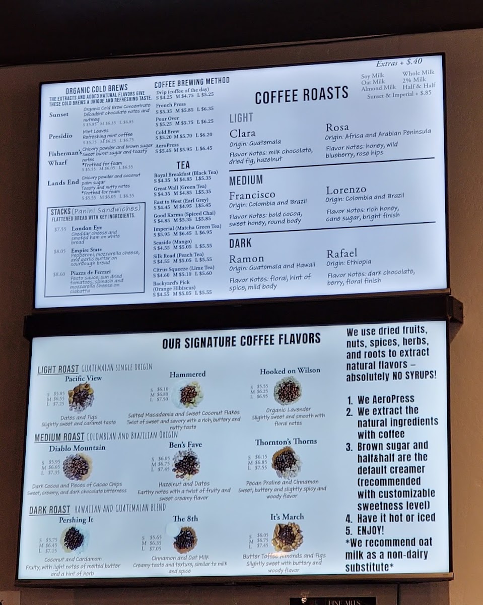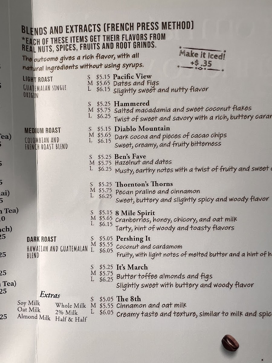 The menu highlights deep, unique flavor profiles, as noted by customers who praise the purity and warmth of these coffees. Whether it’s the complex chocolate undertones in the house-made Sunset Coldbrew or the bold yet balanced tones of the Thornton’s Thorn and Diablo Mountain blends, each cup tells a story of careful selection and fresh preparation.